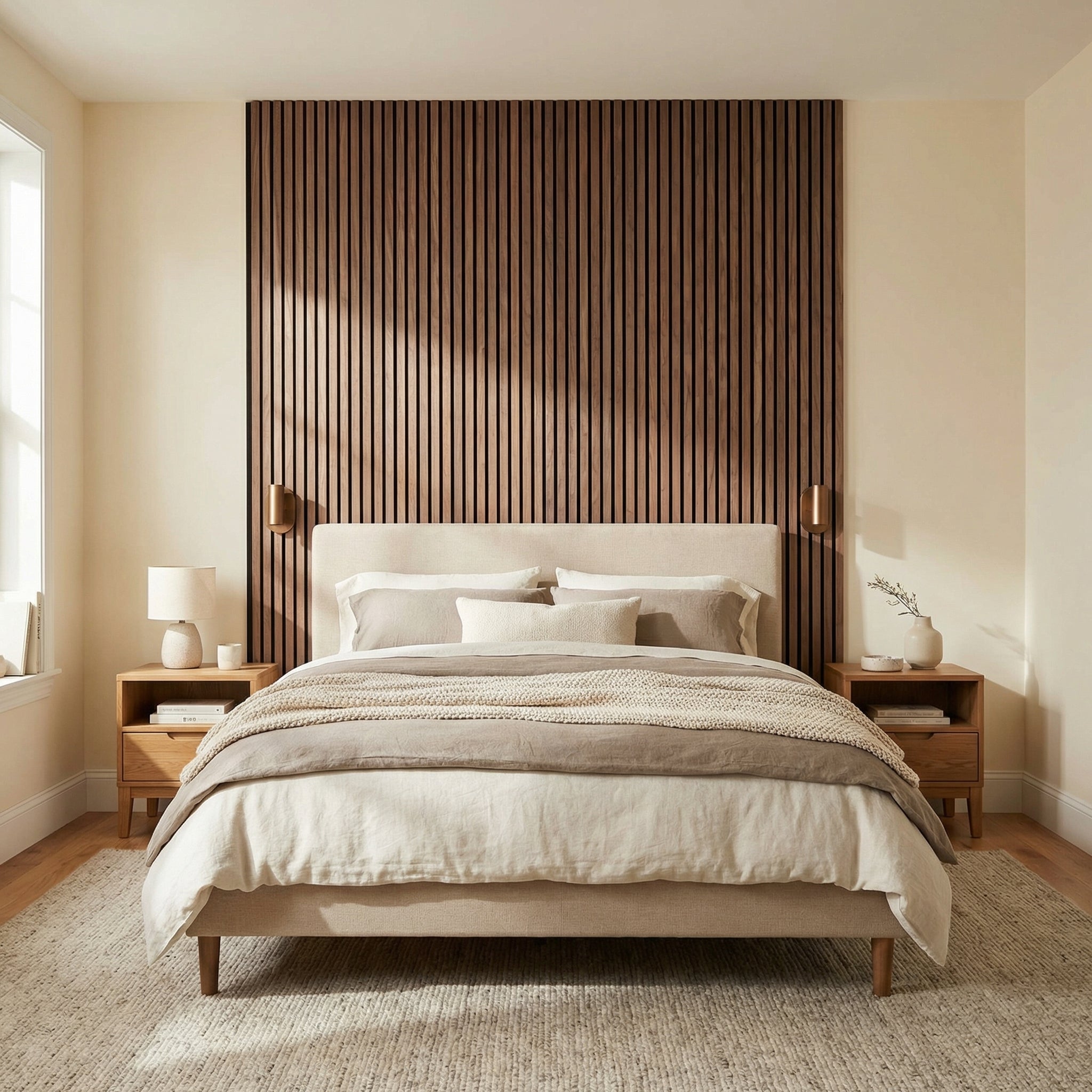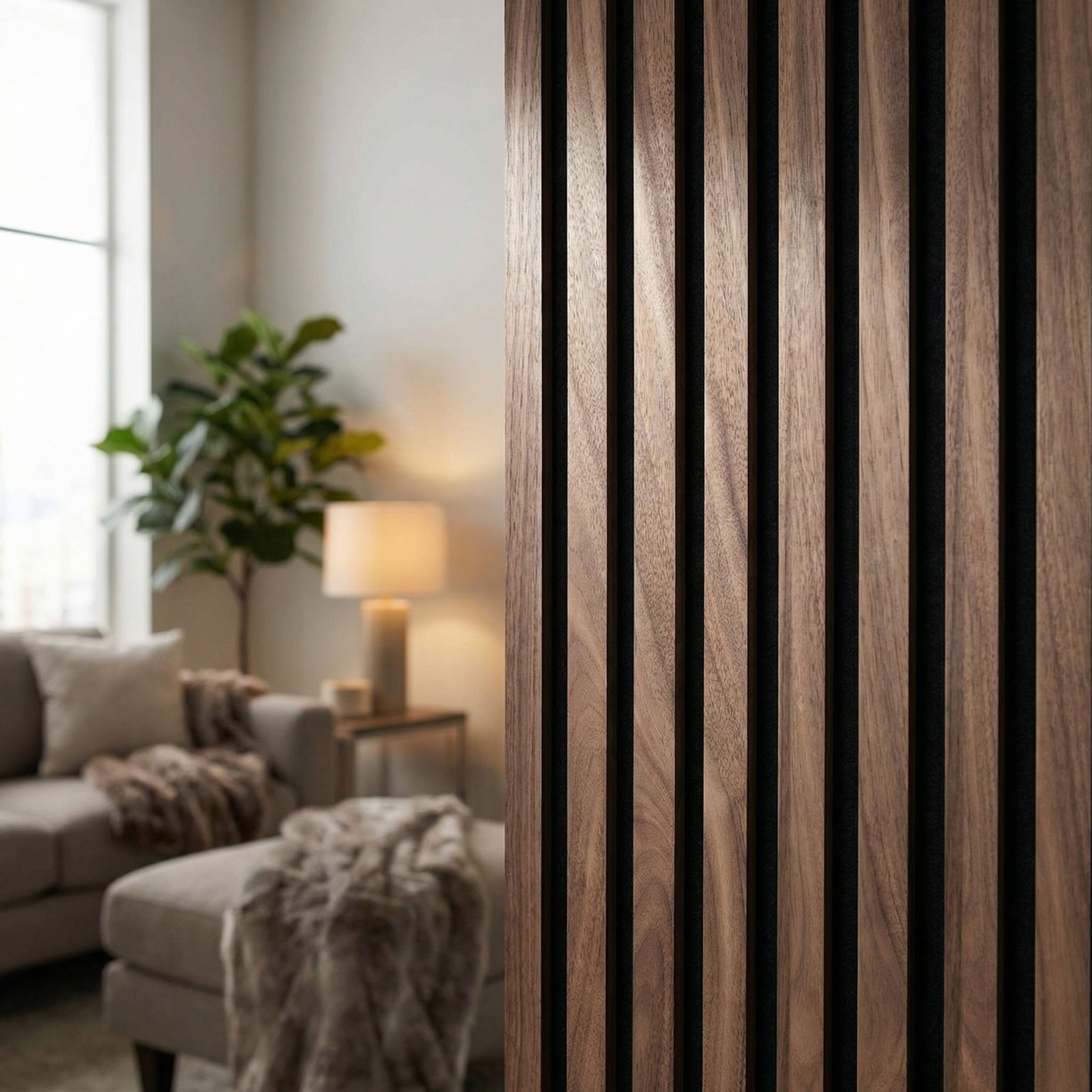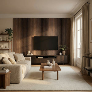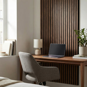 Son contraste entre le bois clair et le fond noir structure immédiatement la pièce et crée un rendu visuel plus net, plus chaleureux et plus contemporain. En plus de son impact déco, ce panneau aide à atténuer la résonance de l’espace, pour un intérieur plus agréable au quotidien, notamment dans les pièces de vie et les zones de télétravail.