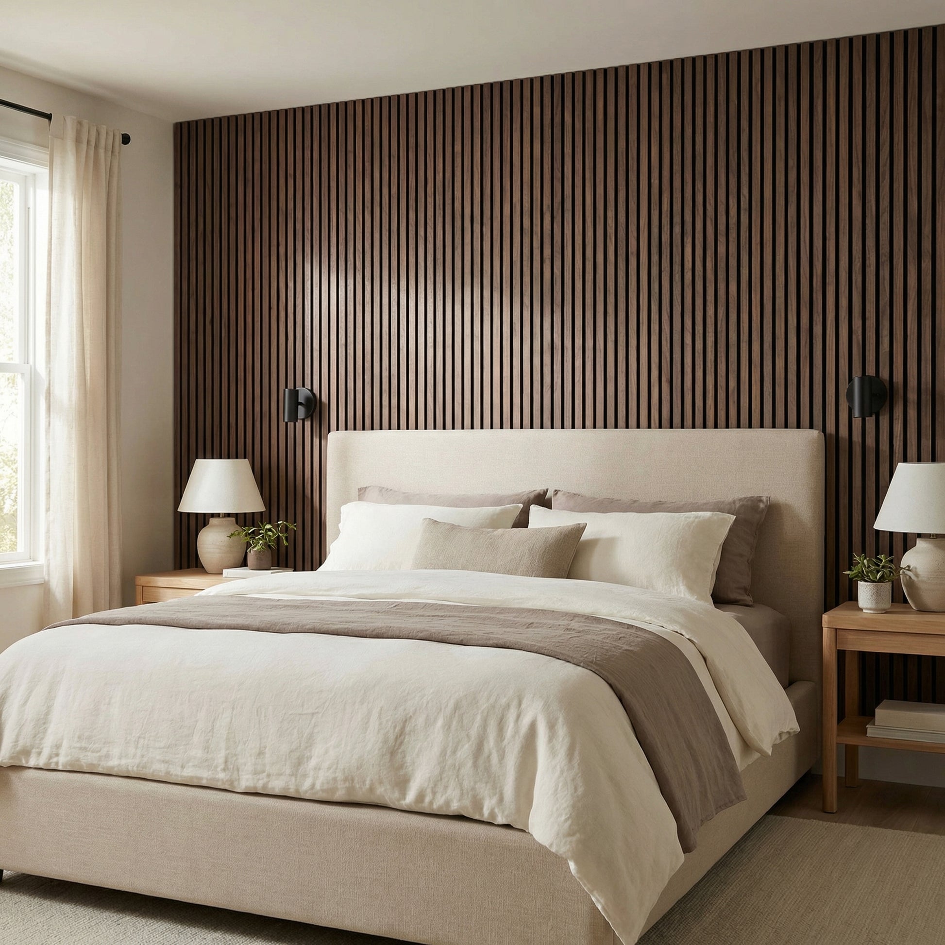 Apportez du relief, de la chaleur et une finition plus haut de gamme à votre intérieur avec ce panneau acoustique mural en bois noyer noir sur feutre noir. Pensé pour les particuliers qui veulent transformer un mur vide sans engager de gros travaux, il s’intègre parfaitement dans un coin bureau, un salon, une chambre ou un espace TV.