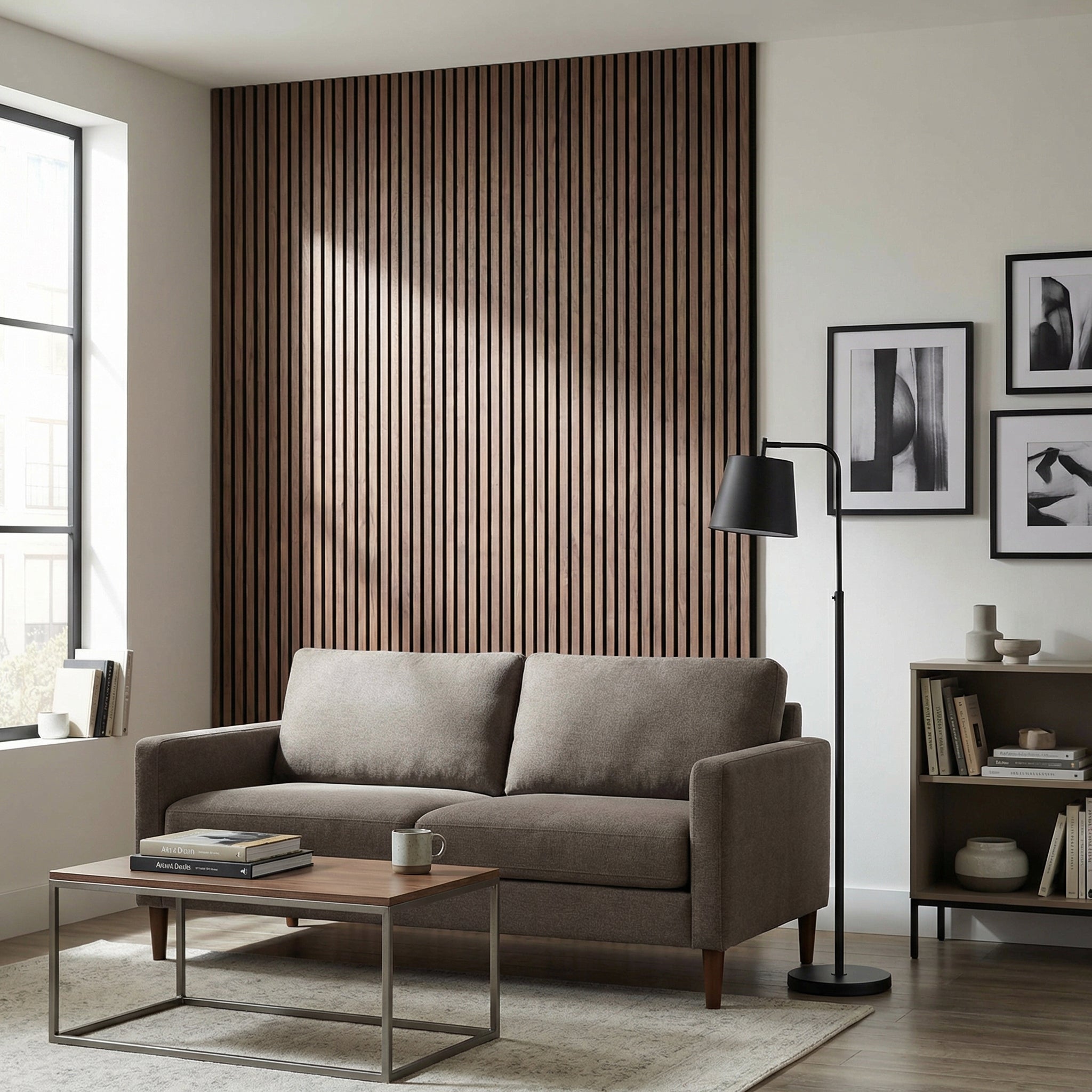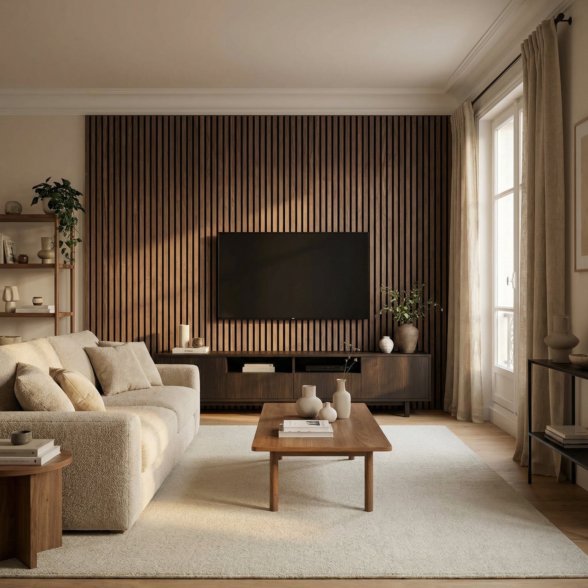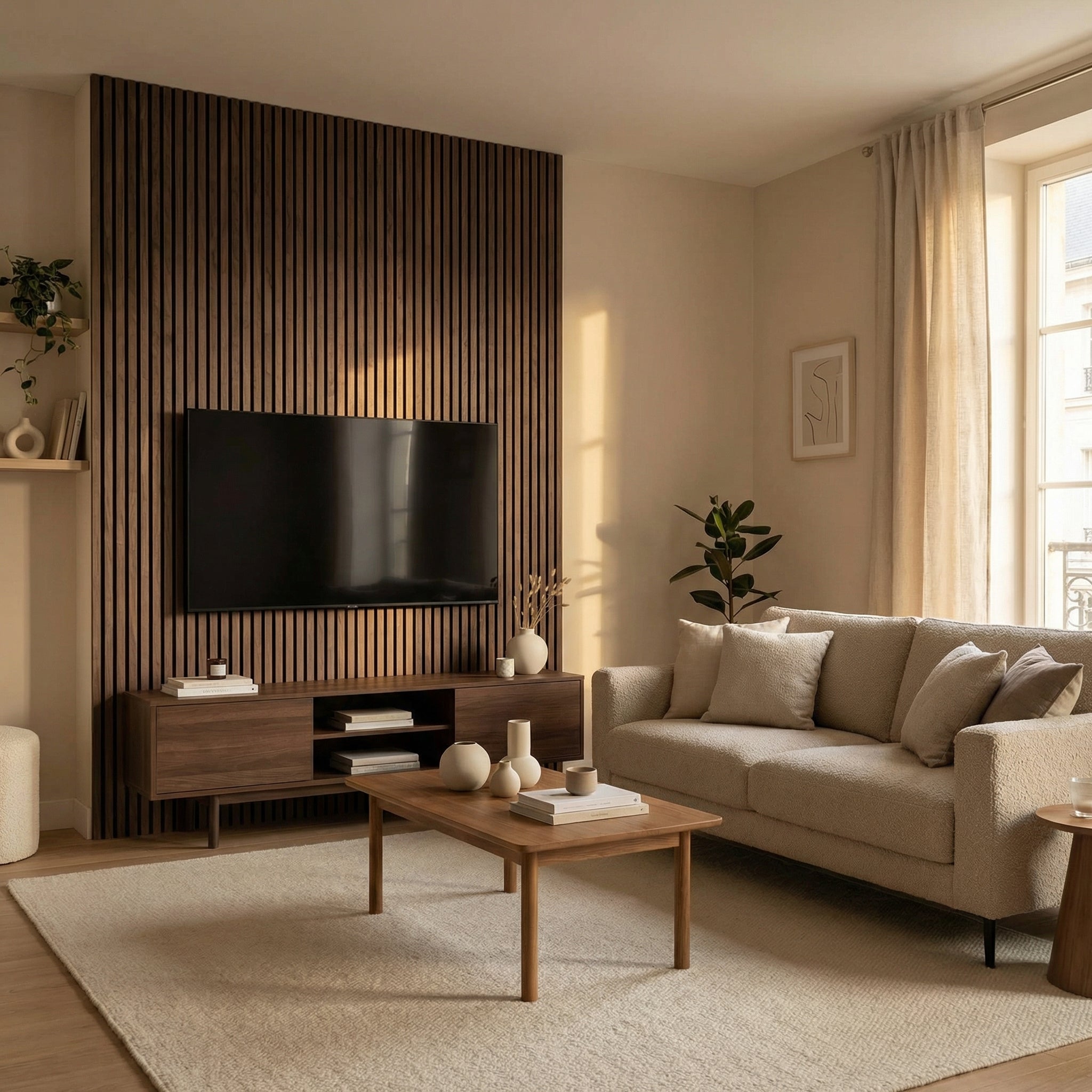 Les panneaux MURA ont un double rôle : ils habillent visuellement le mur et améliorent le confort acoustique de la pièce. Ils apportent du relief, de la chaleur et un rendu plus structuré à l’espace, tout en aidant à atténuer la résonance et l’écho dans les pièces de vie, bureaux ou coins TV.